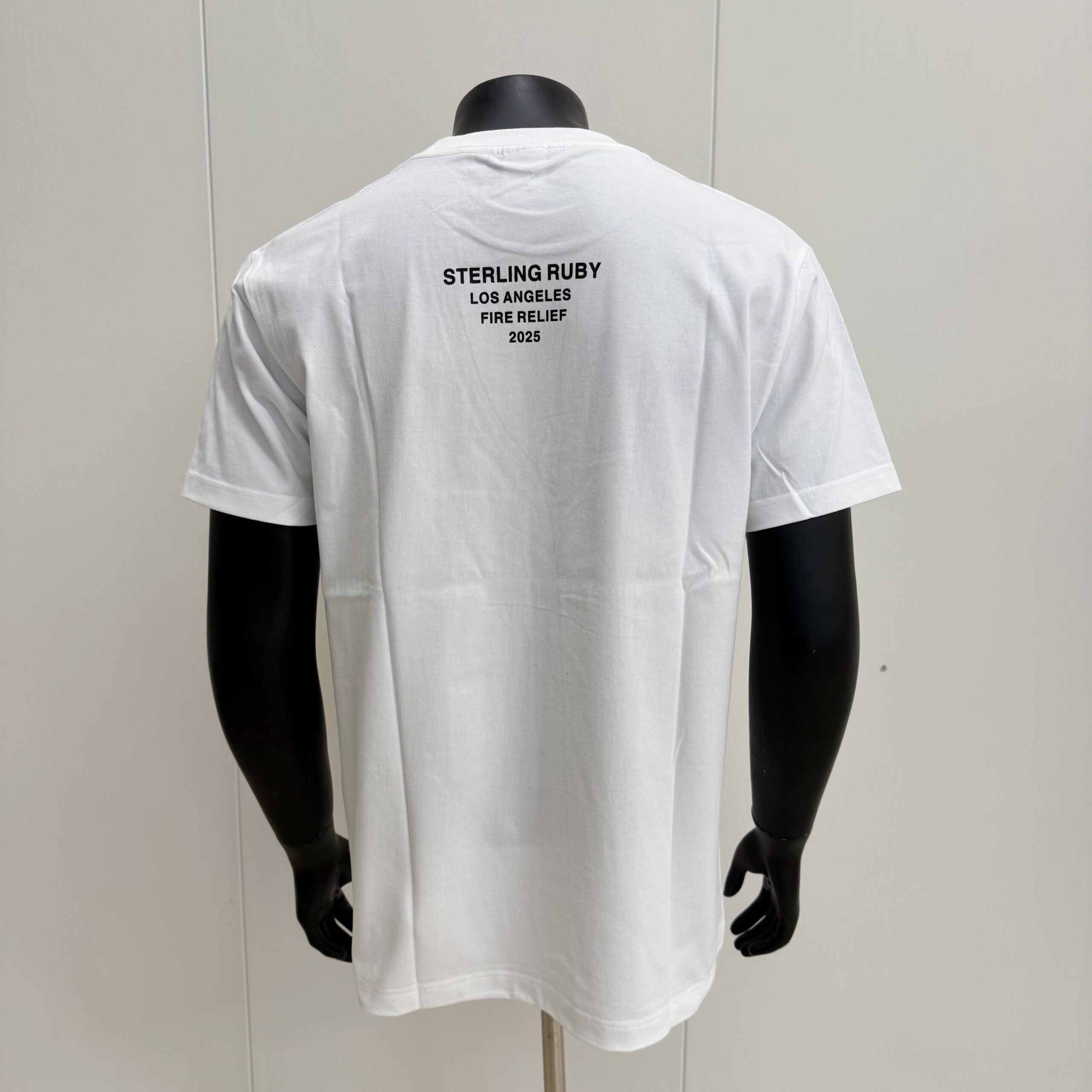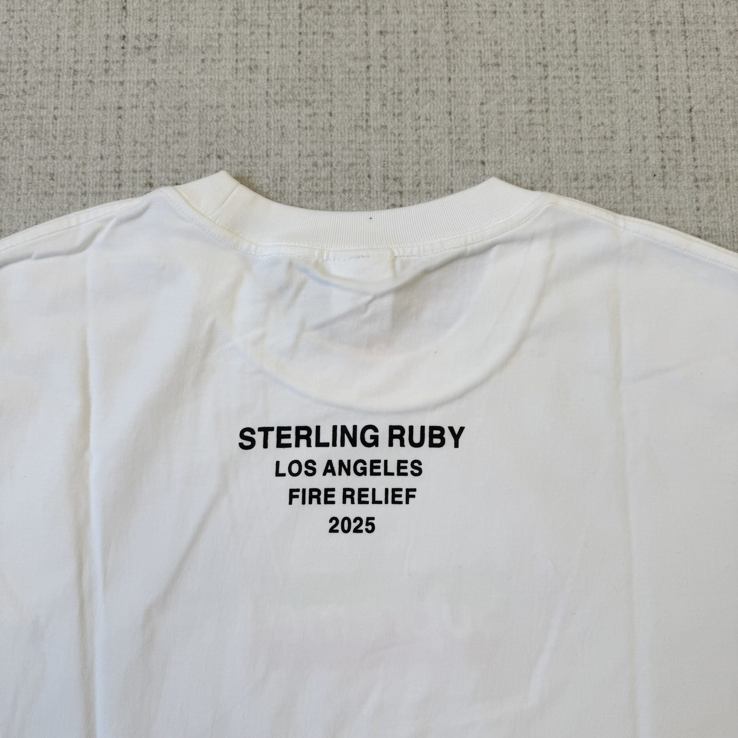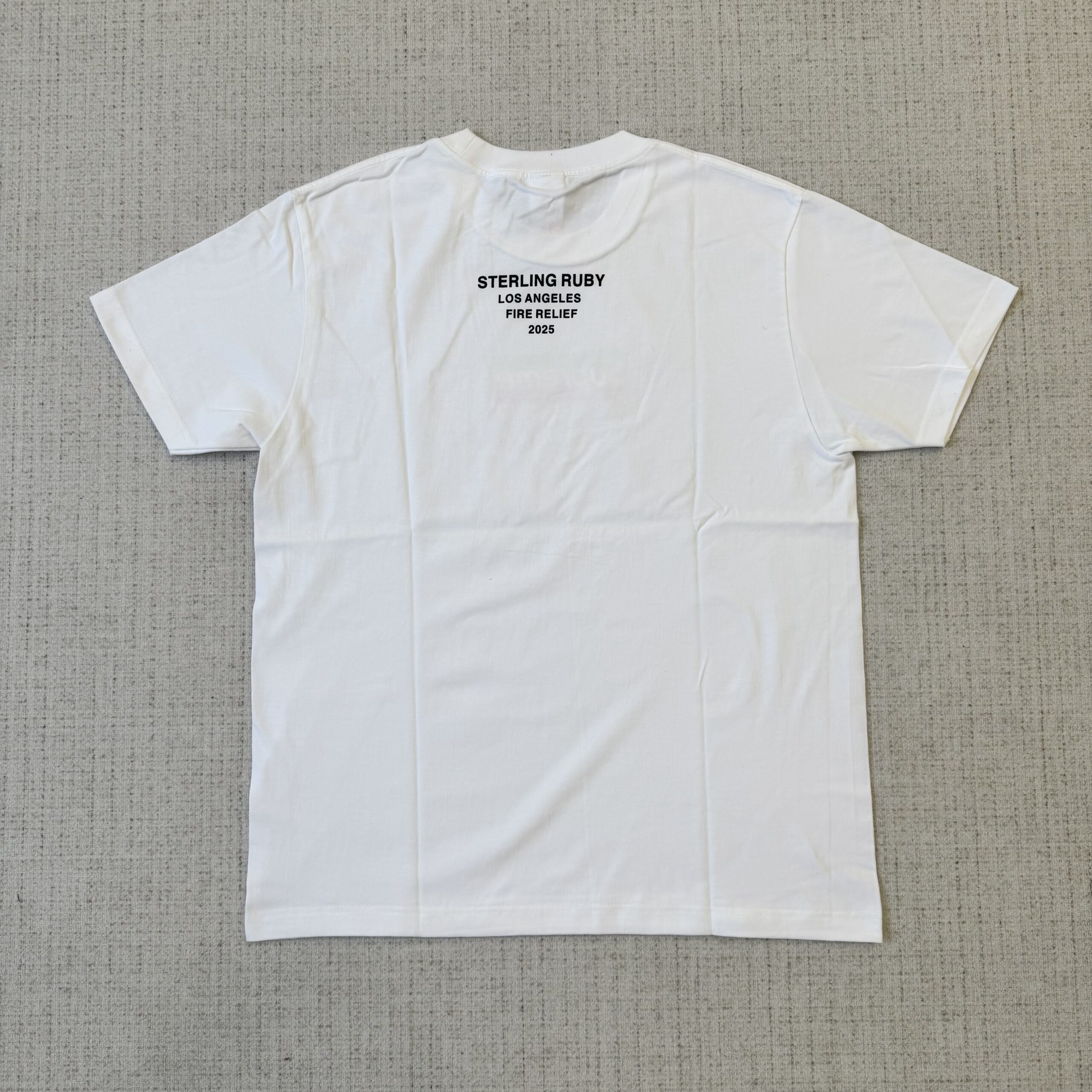 O fundo artístico de Ruby confere ao logo uma textura vibrante e um toque de cor, muitas vezes com tons de verde elétrico e rosa, adicionando uma profundidade visual à simplicidade característica do Box Logo. No verso da camiseta, há um texto discreto que diz: “Sterling Ruby / Los Angeles / Fire Relief / 2025”, destacando a natureza da colaboração.
