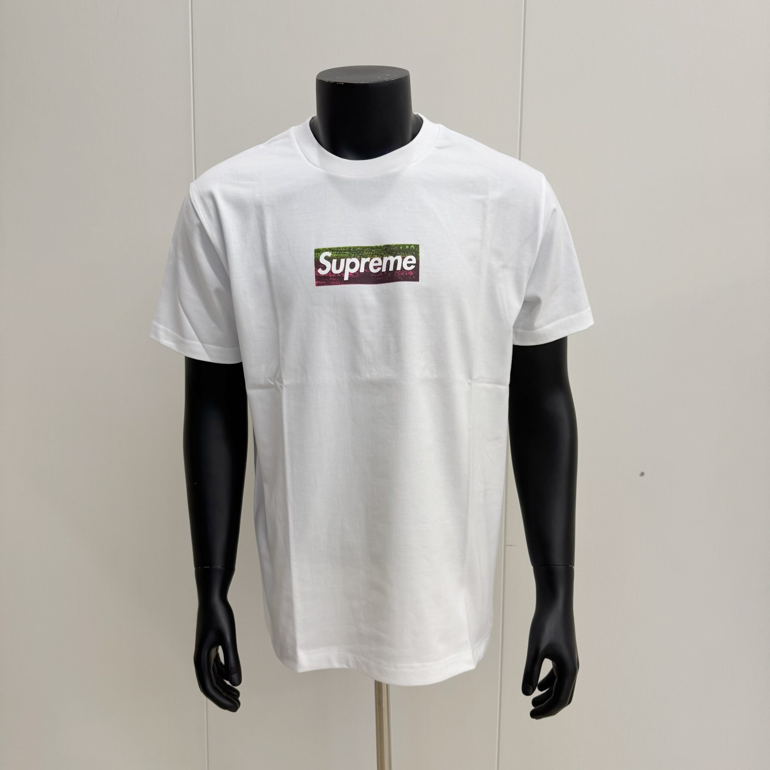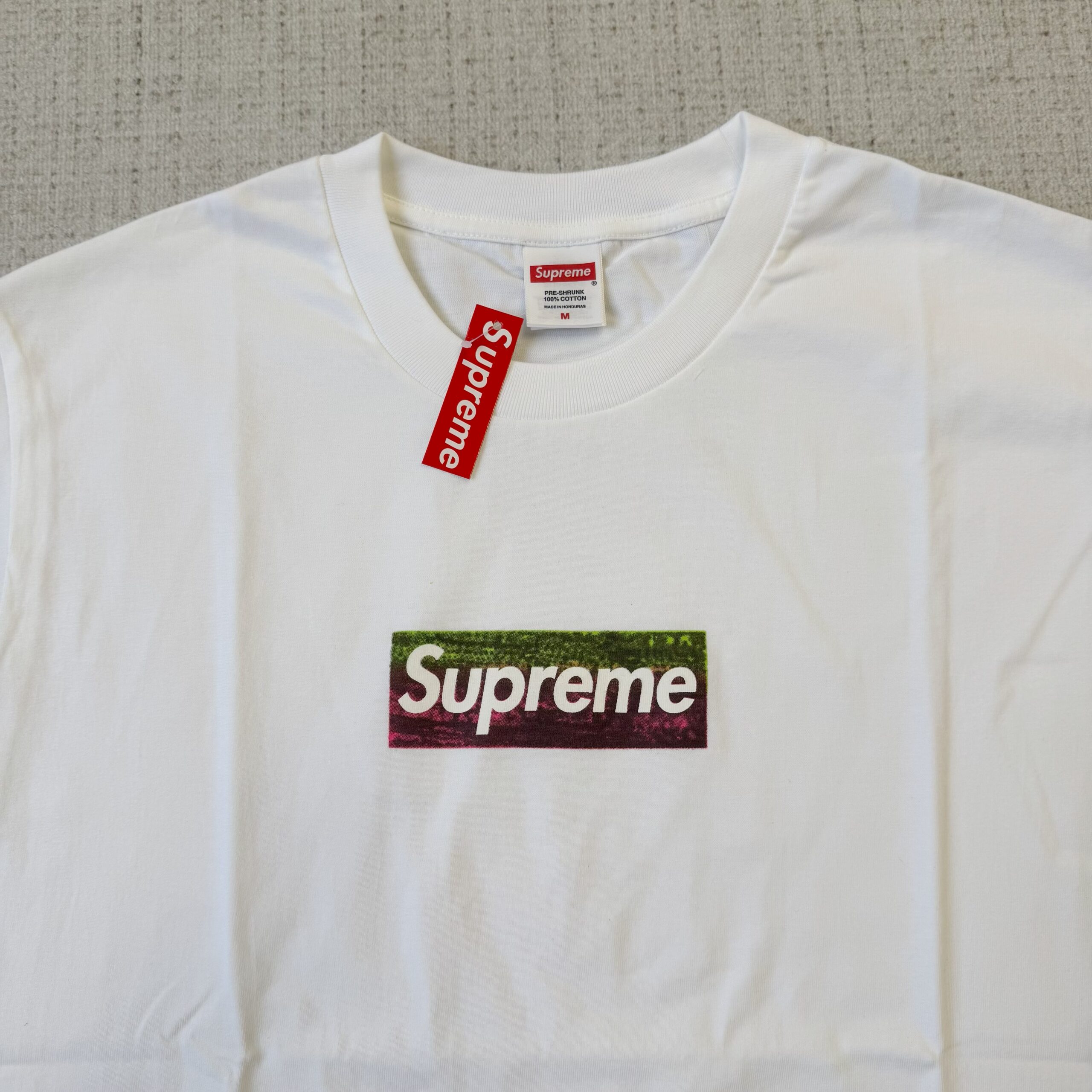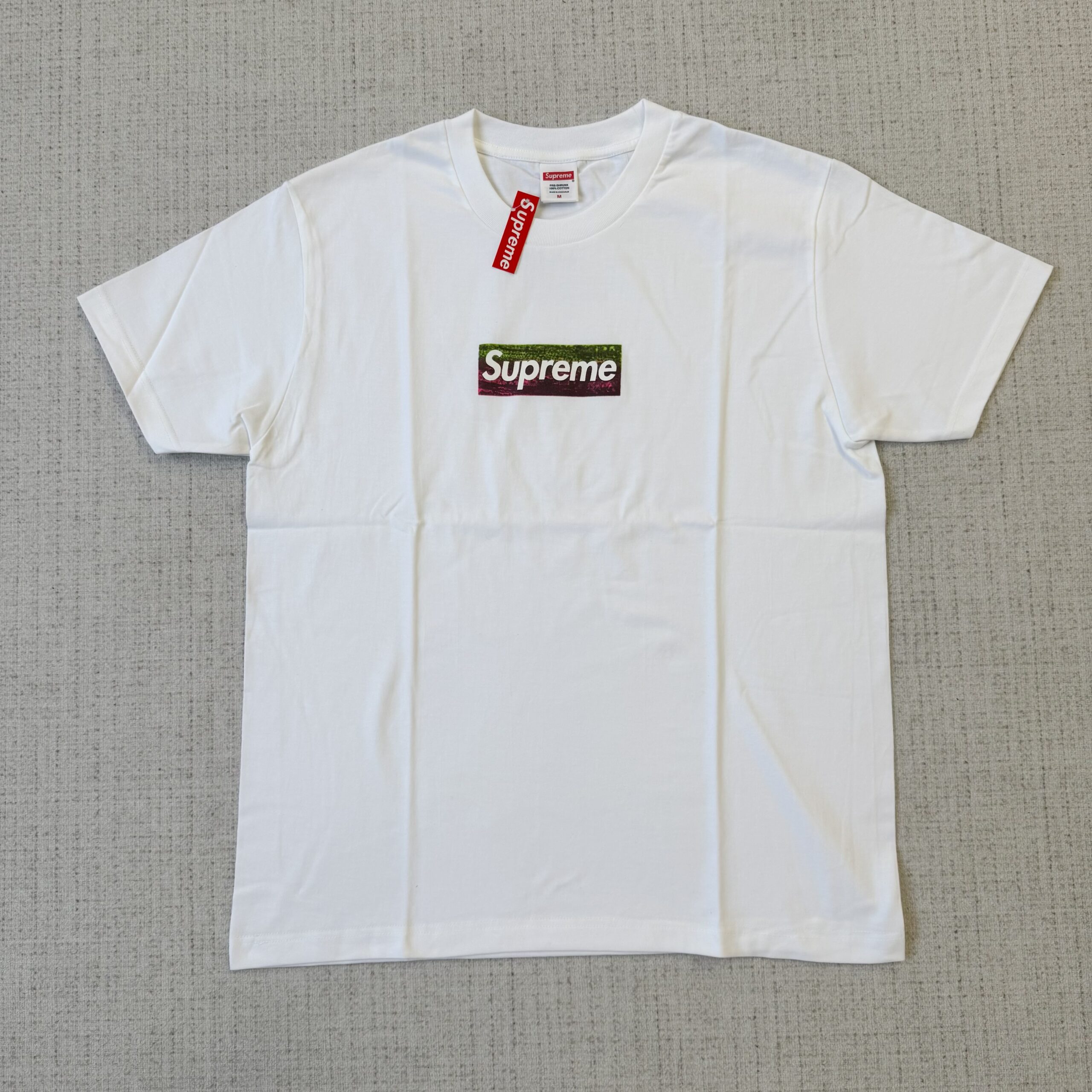Ao contrário das Box Logo Tees tradicionais que apresentam apenas o logo vermelho, esta edição incorpora a obra de Sterling Ruby. A camiseta exibe o clássico Box Logo da Supreme sobreposto a um detalhe da pintura de Ruby, SP184 (2011), da sua série “Spray Paint”. Essa obra é uma reflexão sobre os céus em constante mudança e multicor de Los Angeles, uma paisagem que Ruby observa em seu caminho para o estúdio.