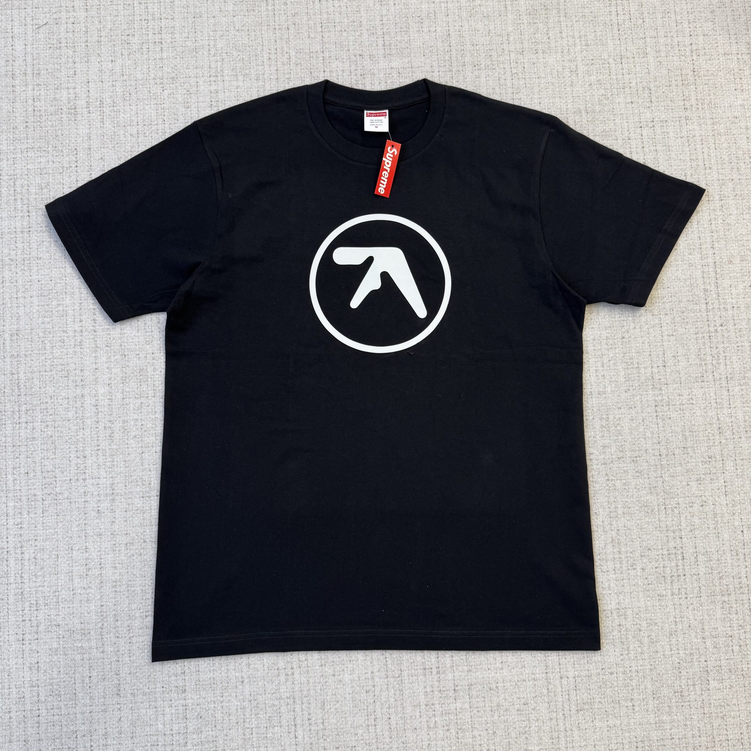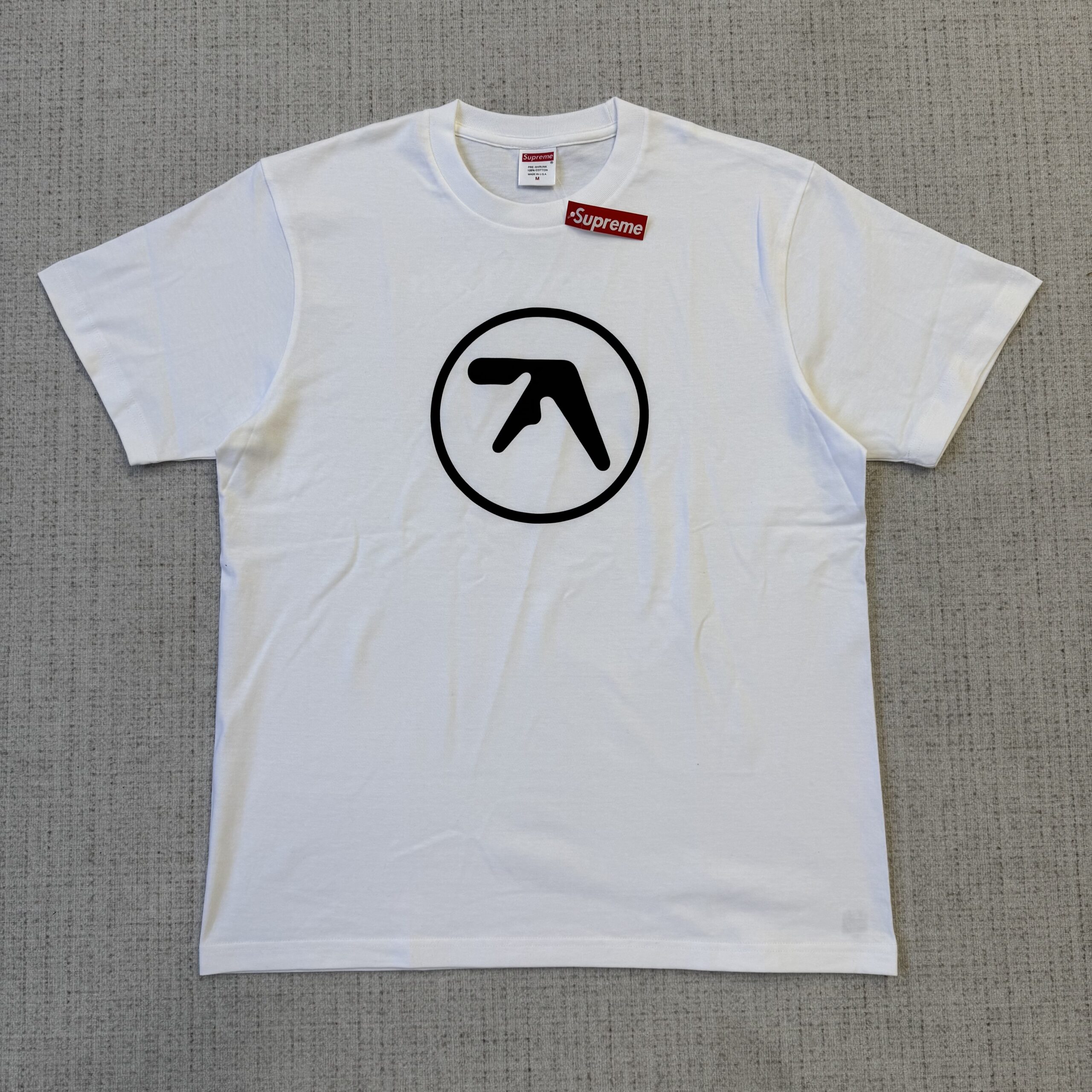 - O logotipo de Aphex Twin: O “A” estilizado, que se tornou sinônimo do artista, pode ser incorporado ao design, às vezes de forma sutil e outras vezes de maneira mais proeminente, talvez combinado com o Box Logo da Supreme ou posicionado separadamente.